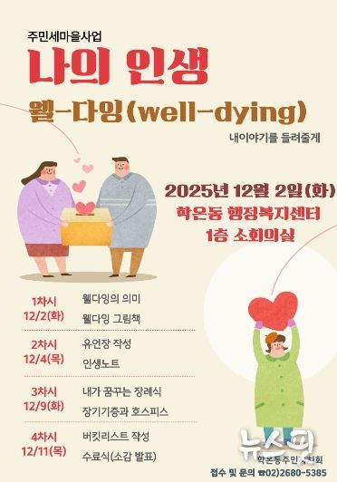 (뉴스핏 = 김호 기자) 광명시 학온동 주민자치회는 오는 12월 2일부터 매주 화요일과 목요일 오후 2시부터 4시까지 총 4회에 걸쳐 ‘웰다잉 교육’을 진행한다.