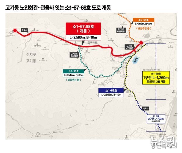 (뉴스핏 = 김수진 기자) 용인특례시는 지난 11월 30일 수지구 고기동 노인회관에서 관음사까지 이어지는 도시계획도로 소1-67·68호선(연장 2.58km)을 개통했다고 1일 밝혔다.