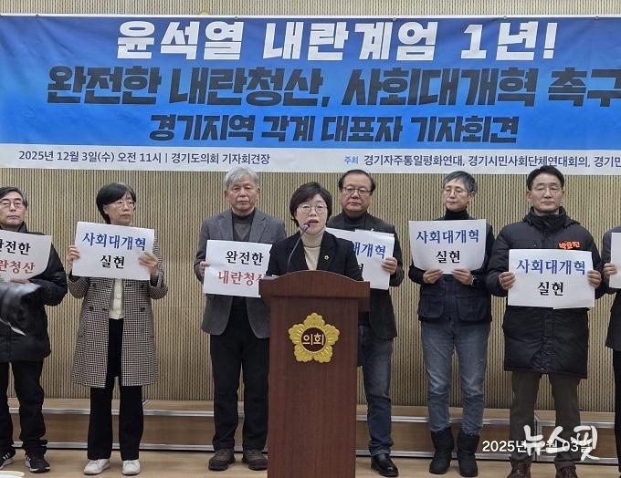 (뉴스핏 = 김수진 기자) 경기도의회 박옥분 의원(더불어민주당, 수원2)은 3일 경기자주통일평화연대·경기민중행동·경기시민사회단체연대회의와 등 시민사회와 함께 ‘윤석열 내란계엄 1년! 완전한 내란청산, 사회대개혁 촉구 경기지역 각계대표자 기자회견’을 추진하며 “경기도에도 여전히 민주주의를 위협하는 내란옹호 세력이 남아 있다”고 강하게 지적했다.