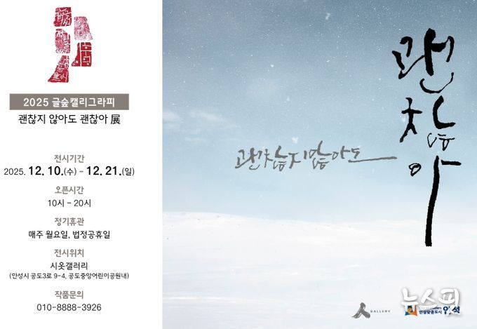 (뉴스핏 = 김수진 기자) 공도 작은미술관 시옷갤러리는 오는 10일부터 21일까지 글숲 캘리그라피 작가들이 참여하는 전시 ‘괜찮지 않아도 괜찮아’ 전을 개최한다고 8일 밝혔다.