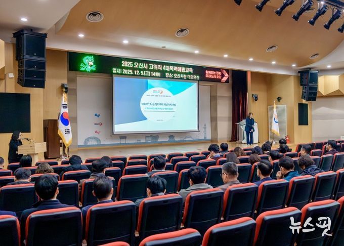 (뉴스핏 = 김수진 기자) 오산시는 지난 5일 시청 대회의실에서 시 및 유관기관 고위직 70여 명이 참석한 가운데 ‘2025년 오산시 고위직 별도 4대 폭력 예방교육’을 실시했다고 밝혔다.