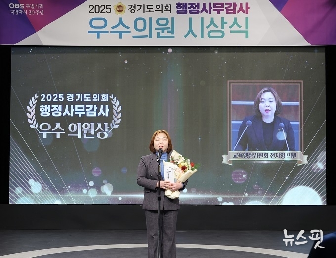 (뉴스핏 = 김수진 기자) 경기도의회 교육행정위원회 전자영 의원(더불어민주당·용인4)이 8일 OBS 경인TV가 주관하는 지방자치 30주년 특집 경기도의회 행정사무감사 우수의원 시상식에서 우수의원으로 선정되는 영예를 안았다.