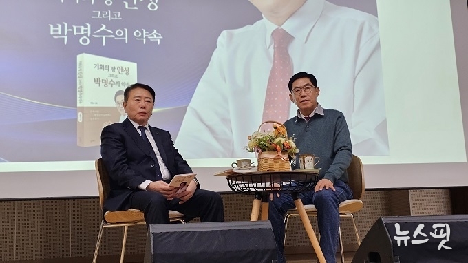최일구 전 아나운서는 '인산 박명수의 삶의 출발과 시간' 그리고 '공직에서의 여정과 선택', '앞으로의 안성과 남겨질 이야기'에 관한 내용을 세부 주제로 박명수 의원과 한 시간에 걸쳐 질문과 답변을 주고 받았다.