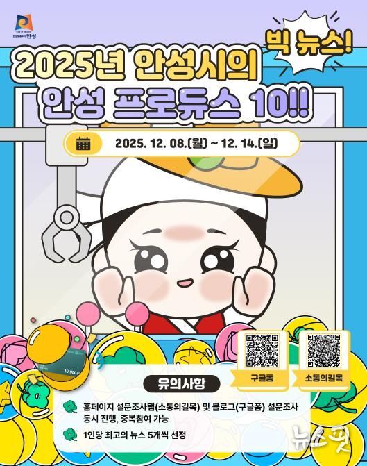 시 관계자는 “2025년 안성이 이뤄낸 의미 있는 변화들은 시민 여러분의 관심과 성원이 있었기에 가능했다”며 “한 해를 마무리하는 시점에 시민분들이 생각하는 ‘올해 안성의 대표 뉴스’ 선정에 많은 참여를 부탁드린다”고 밝혔다.