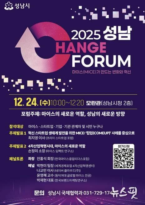 (뉴스핏 = 김수진 기자) 성남시는 오는 24일 오전 10시 성남시청 모란관에서 ‘2025 성남 체인지 포럼(CHANGE Forum)’을 개최한다고 22일 밝혔다.