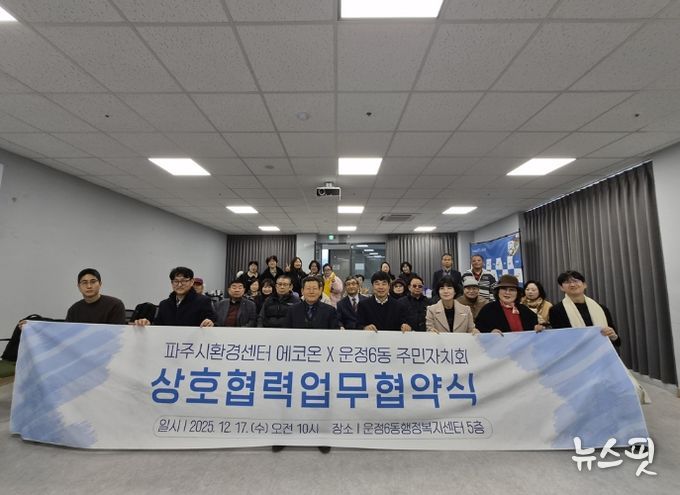 (뉴스핏 = 김호 기자) 운정6동 주민자치회는 12월 17일 오전 10시, 운정6동 행정복지센터에서 파주시환경센터 ‘에코온’과 ‘지역 환경 의제 실천 및 기후행동 협력을 위한 업무협약’을 체결하고, 이어 마을 소식지 '초롱꽃향기로' 2호 제작 성과공유회를 개최했다.