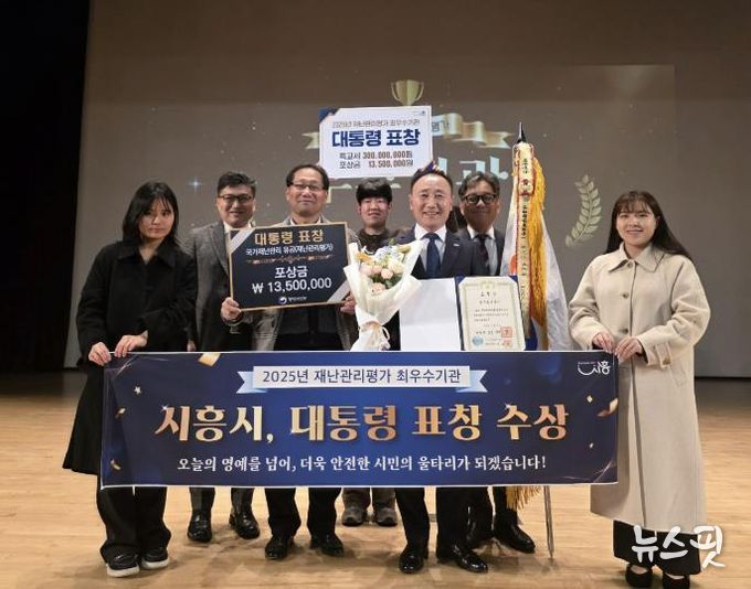 (뉴스핏 = 김수진 기자) 시흥시는 행정안전부가 주관한 ‘2025년 재난관리평가’에서 최우수기관으로 선정돼 지난 22일 정부세종청사 국토교통부 대강당에서 열린 시상식에서 대통령 표창을 받고 특별교부세 3억 원과 포상금 1,350만 원을 확보했다.