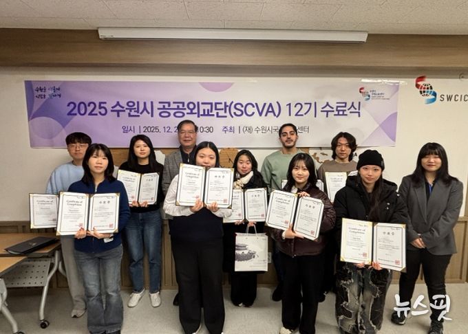 (뉴스핏 = 김호 기자) 수원시국제교류센터가 22일 센터에서 ‘수원시 공공외교단(SCVA) 12기’ 수료식을 열고, 단원 16명에게 수료증을 전달했다. 우수활동자 4명에게는 상장을 수여했다.