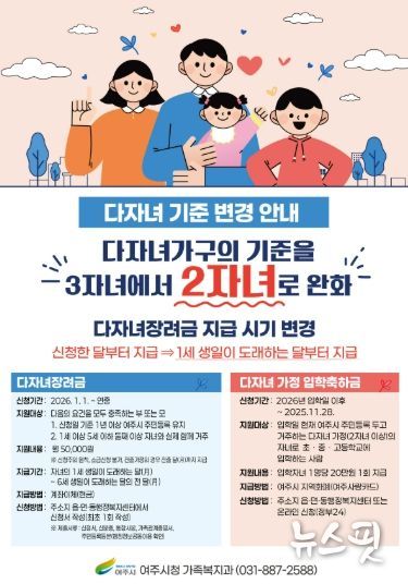 여주시 가족복지과 관계자는 “이번 제도 개선을 통해 다자녀 가정에 대한 사회적 인식을 확대하고 출산과 양육에 대한 경제적인 부담을 실질적으로 완화하여 아이 낳고 키우기 좋은 여주를 조성해 나가겠다”고 말했다.