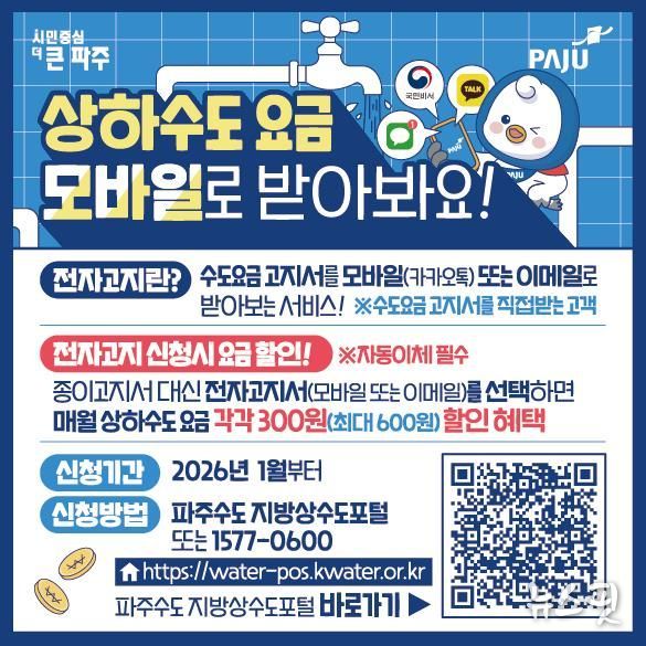 (뉴스핏 = 김호 기자) 파주시는 2026년 1월부터 수도요금 전자고지와 자동납부를 동시에 신청하는 시민에게 수도요금을 할인하는 제도를 시행한다고 밝혔다.