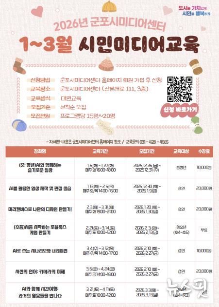 (뉴스핏 = 김수진 기자) 군포시미디어센터는 시민들의 미디어 활용 역량 강화를 위해 2026년 1분기 미디어교육 프로그램 수강생을 모집한다.