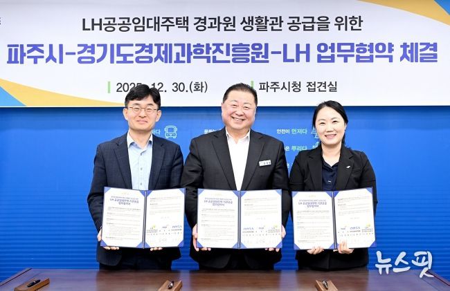 (뉴스핏 = 김수진 기자) 파주시는 30일 경기도경제과학진흥원, 한국토지주택공사 경기북부지역본부와 경과원 파주시 이전에 따른 엘에이치(LH) 공공임대주택 생활관 지원을 위한 업무협약을 체결했다고 밝혔다.
