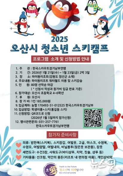 이권재 오산시장은 “이번 겨울 스키캠프는 청소년들이 자연 속에서 다양한 체험활동을 통해 협동심과 도전정신을 기를 수 있는 소중한 기회가 될 것”이라며, “앞으로도 청소년의 건강한 성장과 건전한 여가활동을 지원하는 체험형 프로그램을 지속적으로 확대해 나가겠다”고 말했다.