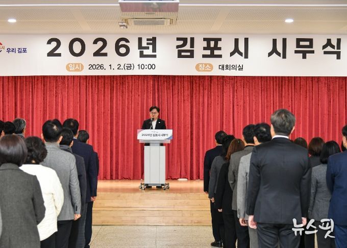 이날 시무식에는 김병수 김포시장을 비롯해 실·국·소장, 부서장 등 간부 공직자 100여 명이 참석해 새해 시정 운영 방향을 공유하고, 시민 중심의 시정 추진과 새로운 도약을 향한 결의를 다졌다.