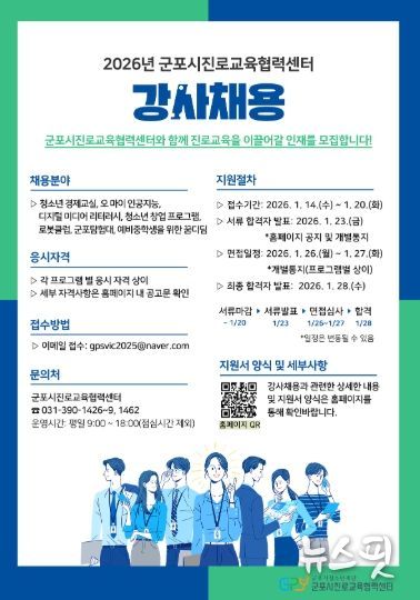 (뉴스핏 = 김수진 기자) (재)군포시청소년재단 군포시진로교육협력센터는 관내 청소년의 진로 탐색과 진로 역량 강화를 위해 '2026년 군포시진로교육협력센터 강사'를 채용한다고 밝혔다.