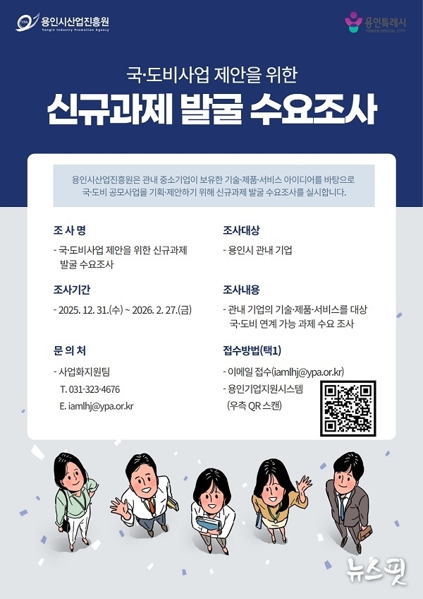 (뉴스핏 = 김수진 기자) 용인시산업진흥원은 2026년 국·도비 공모사업 대응을 위해 용인 소재 기업을 대상으로 신규과제 발굴 수요조사에 착수했다고 8일 밝혔다.