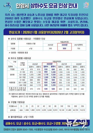 (뉴스핏 = 김수진 기자) 안양시는 상하수도 생산원가 상승과 노후 시설 정비를 위한 대규모 투자 재원 확보를 위해 2026년 1월 사용분(2월 고지분)부터 상하수도 요금을 인상한다고 11일 밝혔다. 이번 인상은 고물가 상황 속에서 시민들의 경제적 부담을 최소화하기 위한 ‘단계적 현실화 계획’에 따른 것이다.