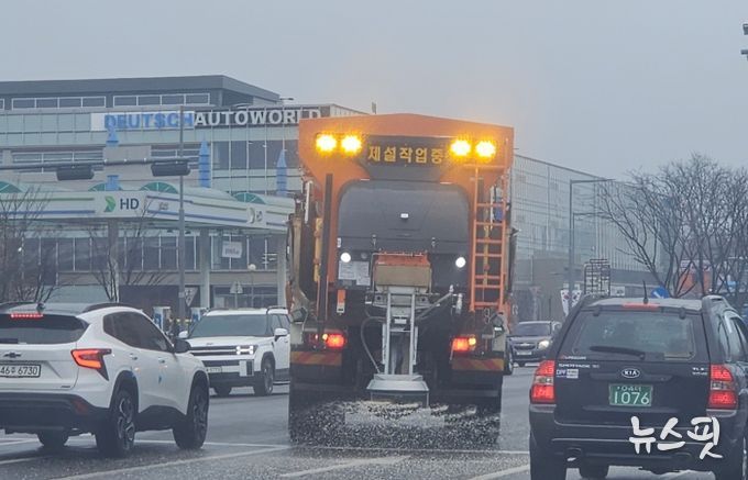 (뉴스핏 = 김호 기자) 수원시가 10일 선제적으로 제설제를 살포해 블랙아이스(도로결빙)에 대비했다.