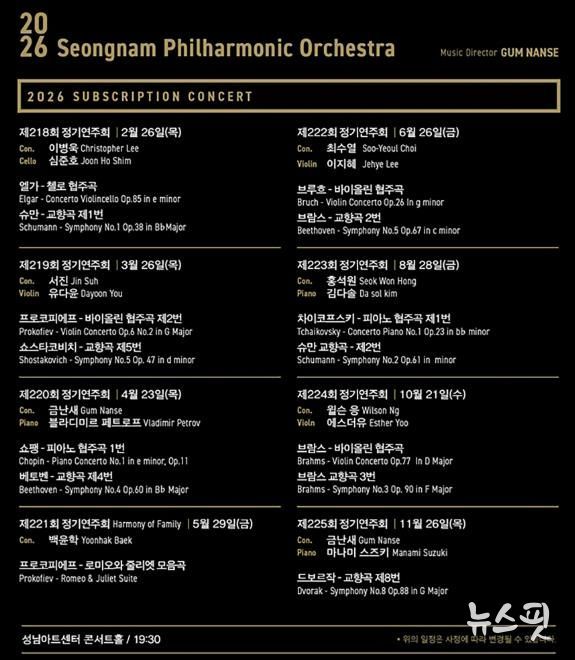 2026년 총 8회 정기공연 라인업을 확정하고, 1월 12일 오후 2시 시즌권을 놀(NOL) 티켓을 통해 오픈한다. 성남시향의 예술총감독 금난새 지휘자를 비롯하여 이병욱, 서진, 백윤학, 최수열, 홍석원, 윌슨 응의 지휘와 첼리스트 심준호, 바이올리니스트 유다윤, 피아니스트 블라디미르 페트로프, 바이올리니스트 이지혜, 피아니스트 김다솔, 바이올리니스트 에스더유, 피아니스트 마나미 스즈키 등의 화려한 협연자를 초청하여 올해 최고의 정기연주회를 마련한다.