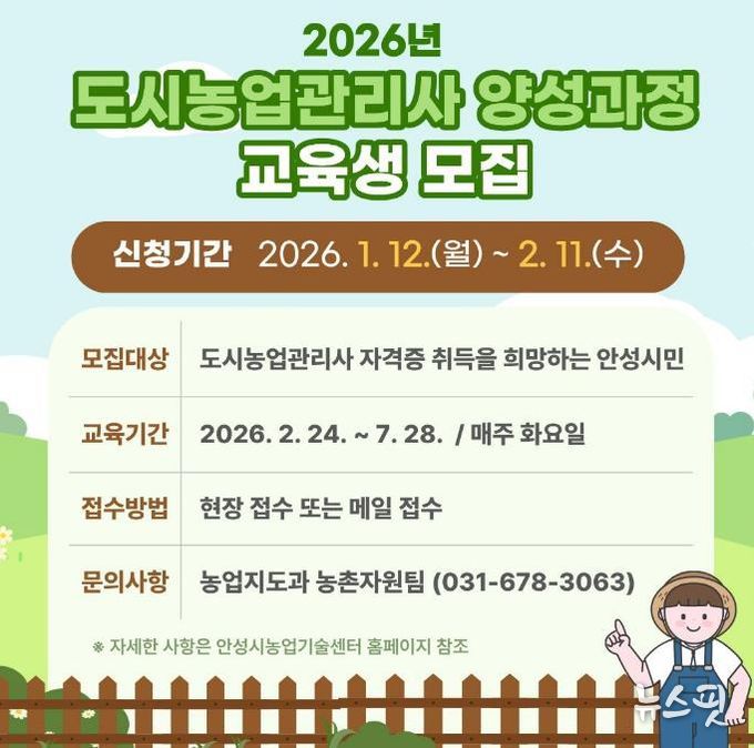 (뉴스핏 = 김수진 기자) 안성시농업기술센터는 2월 11일까지 도시농업 전문인력 양성을 위한 ‘제7기 도시농업관리사 양성과정’ 교육생을 모집한다고 12일 밝혔다.
