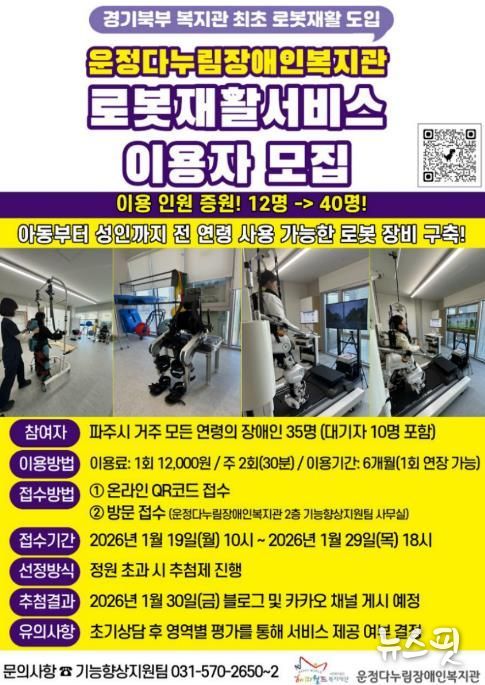 2025년 9월 개관한 운정다누림장애인복지관은 경기북부 최초로 최첨단 로봇 재활 장비인 지면 보행형 로봇 재활 훈련 장치(워크봇)와 웨어러블 로봇을 도입해 운영하고 있다. 이를 통해 뇌병변·발달·지체장애 등으로 보행에 어려움을 겪는 장애인을 대상으로 로봇 기반 보행훈련을 제공하며 올바른 보행유형 형성과 근신경 재교육을 체계적으로 지원하고 있다.