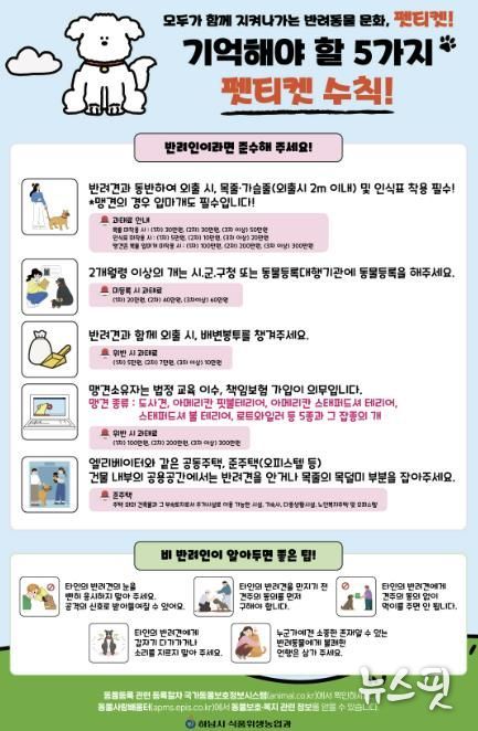홍보물에는 ▲외출 시 목줄·가슴줄(2m 이내) 및 인식표 착용 ▲2개월령 이상 반려견의 동물등록 ▲배변 봉투 지참 ▲맹견 소유자의 법정 교육 이수 ▲엘리베이터 내 반려동물 안기 등 '기억해야 할 5가지 펫티켓'이 담겼다. 비반려인을 위해서도 타인의 반려견을 응시하거나 동의 없이 만지지 않기 등의 에티켓을 함께 안내해 주민 간 갈등 예방에 힘쓰고 있다.