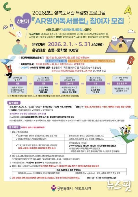 (뉴스핏 = 김수진 기자) 용인특례시 성복도서관은 오는 16일부터 2026년 ‘AR(Accelerated Reader)영어독서클럽’ 상반기 참여자 100명을 모집한다고 15일 밝혔다.