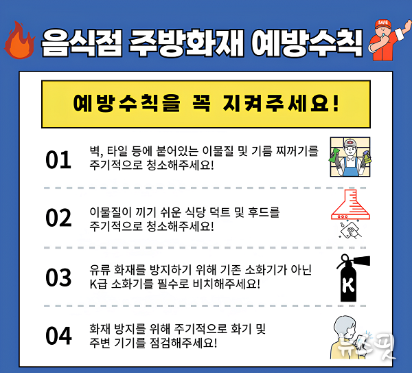 겨울철 음식점 화재를 예방하기 위해 ▲주방 내 가스레인지 주변에 소화기와 K급 소화기를 비치 ▲동‧식물 기름을 제거할 수 있는 필터 등 설치 ▲자동확산소화장치 및 가스차단기를 설치 ▲노후된 전선 교체 등 안전수칙을 준수하여야 한다.