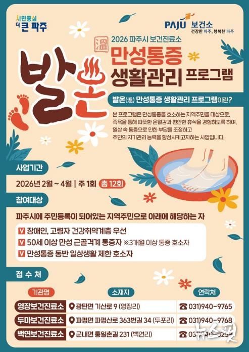 (뉴스핏 = 김수진 기자) 파주시 보건진료소는 보건의료 취약지역 주민들의 건강증진을 위해 2026년 ‘발온(溫) 만성통증 생활관리’교실을 운영한다.