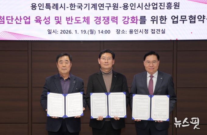 (뉴스핏 = 김수진 기자) 용인특례시는 19일 시청 접견실에서 한국기계연구원(KIMM), 용인시산업진흥원과 ‘첨단산업 육성 및 반도체 경쟁력 강화를 위한 업무협약’을 체결했다.