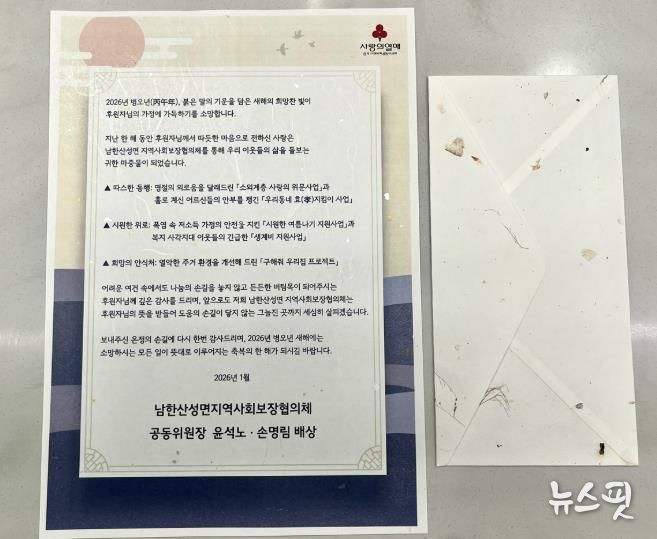 (뉴스핏 = 김호 기자) 광주시 남한산성면 지역사회보장협의체는 2026년 병오년(丙午年) 새해를 맞아 지난 한 해 동안 지역 내 어려운 이웃을 위해 나눔을 실천해 온 후원자들에게 감사의 마음을 담은 서한문을 발송했다고 21일 밝혔다.