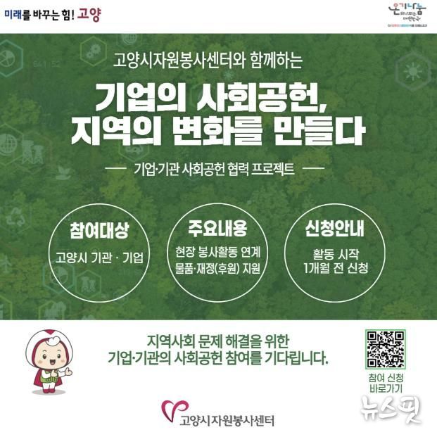 한편, 고양시자원봉사센터는 작년 총 13개 기업·기관과 협력해 489명의 임직원이 참여하는 사회공헌 활동을 추진했으며, 환경정화 및 생태 보호, 취약계층 지원 등 지역사회 문제해결을 위한 다양한 프로그램을 운영한 바 있다.
