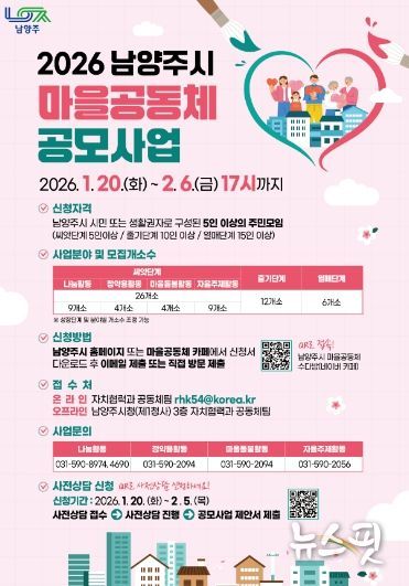 (뉴스핏 = 김호 기자) 남양주시는 1월 20일부터 2월 6일까지 ‘2026년 마을공동체 공모사업’참여 공동체를 공개 모집한다.