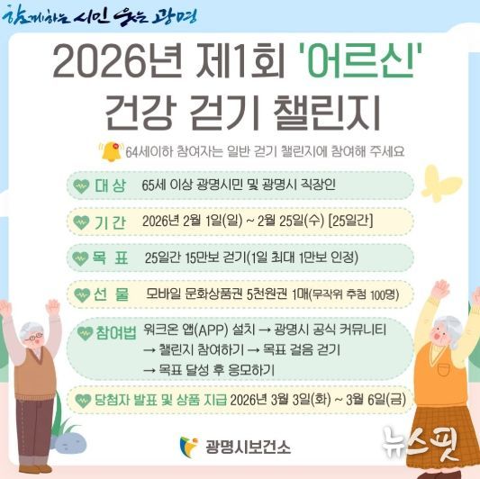 (뉴스핏 = 김수진 기자) 광명시가 오는 2월부터 모바일 걷기 플랫폼 ‘워크온(WalkOn)’을 활용한 걷기 챌린지 방식을 개편하고, 65세 이상 시민을 위한 ‘어르신 걷기 챌린지’를 별도로 운영한다고 21일 밝혔다.
