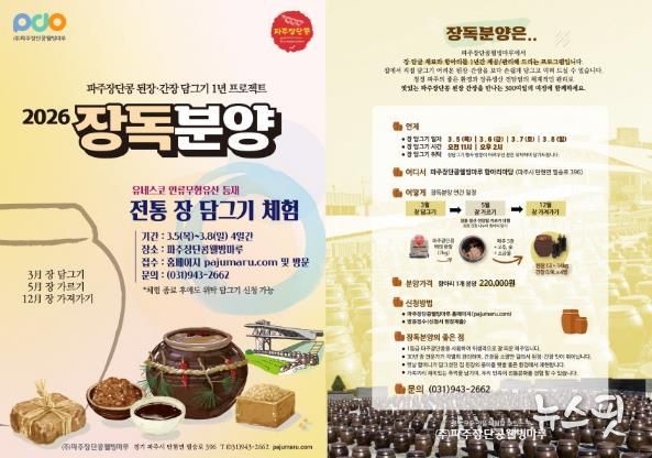(뉴스핏 = 김호 기자) 파주시 출자기관인 ㈜파주장단콩웰빙마루에서는 2026 장독분양 신청자를 본격 모집한다.