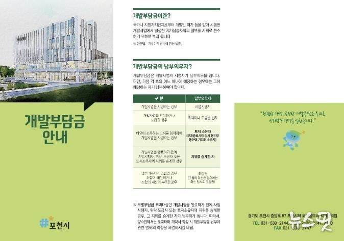 (뉴스핏 = 김호 기자) 포천시는 토지 개발사업 시 발생하는 개발부담금 제도에 대해 알기 쉽게 정리한 홍보물을 제작해 공인중개사사무소, 측량설계사무소, 행정사사무소, 인허가 관련 부서 등에 배부했다.