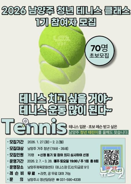(뉴스핏 = 김호 기자) 남양주시는 27일부터 내달 2일까지 ‘2026 남양주 청년 테니스 클래스 1기’ 참여자를 모집한다고 밝혔다.