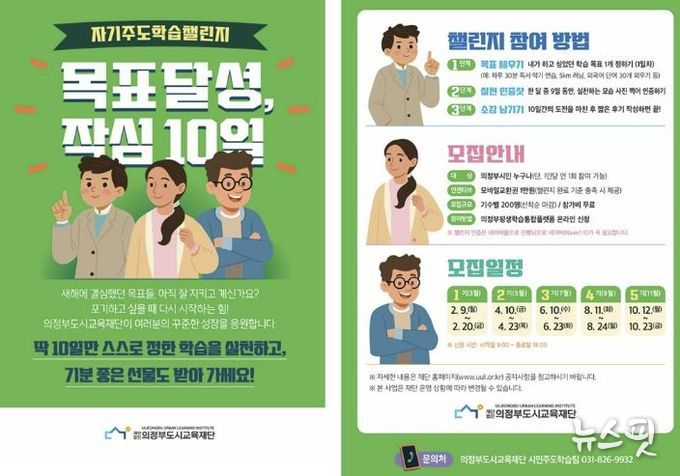 (뉴스핏 = 김호 기자) 의정부도시교육재단은 의정부 시민대학 ‘도전실험실’의 핵심 프로그램으로 자기주도학습챌린지 ‘목표달성, 작심 10일’을 운영한다고 밝혔다.