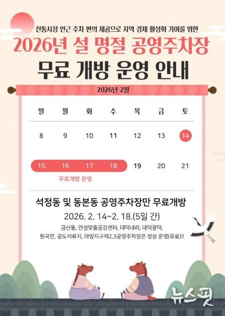 (뉴스핏 = 김수진 기자) 안성시시설관리공단은 2026년 설 명절을 맞아 2월 14일부터 18일까지 5일간, 공단이 관리하는 공영주차장 중 전통시장 인근에 위치한 석정동 공영주차장과 동본동 공영주차장을 한시적으로 무료 개방한다고 28일 밝혔다.