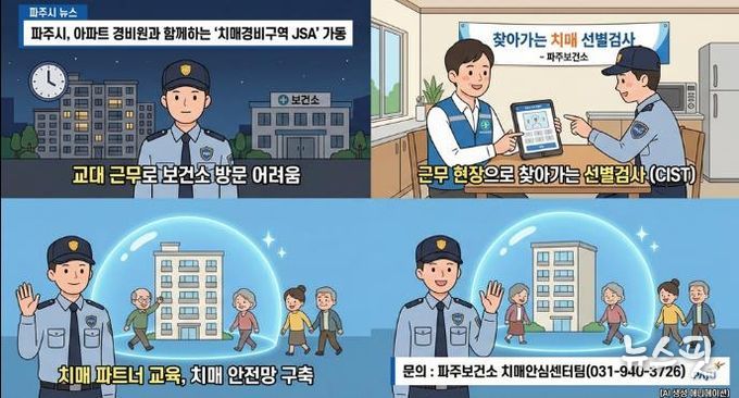 (뉴스핏 = 김수진 기자) 파주시는 오는 2월부터 관내 아파트 단지 경비원을 대상으로 찾아가는 치매 조기 검진 및 예방 프로그램인 ‘치매경비구역 제이에스에이(JSA)’사업을 본격 추진한다고 밝혔다.
