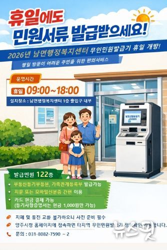 이번 조치는 휴일에도 원활한 민원서류 발급이 가능하도록 시설을 자체적으로 보완해 추진됐으며, 평일 방문이 어려운 직장인과 군인 등 주민들의 행정 이용 편의가 크게 향상될 것으로 기대된다.