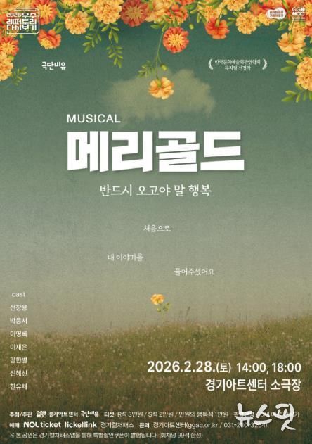 또, 경기아트센터 소극장에서 공연하는 뮤지컬 ‘메리골드’ 관람 할인 문화소비쿠폰이 지원된다. 공연은 오는 28일 토요일 오후 2시와 6시 총 2회 진행되며, 좌석 등급은 R석(3만 원), S석(2만 원), 만원의 행복석(1만 원)으로 구성된다.