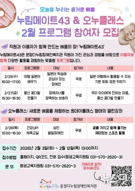 (뉴스핏 = 김호 기자) 파주시 운정다누림장애인복지관은 참여형 평생학습 프로그램 ‘누림메이트43’을 운영하며, 정규 강좌로는 담기 어려운 소규모 학습 수요를 반영한 생활 밀착형 배움을 실천하고 있다.