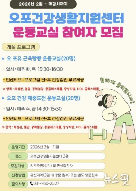 참여를 희망하는 시민은 오포건강생활지원센터로 전화 예약 후 3일 이내 방문 접수하거나 직접 방문해 신청하면 된다.