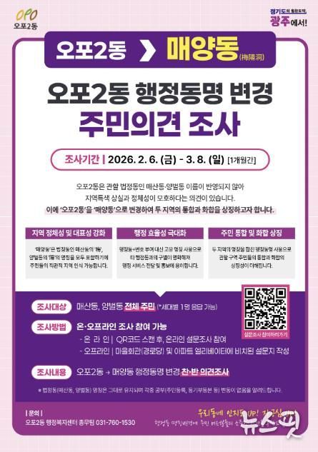 (뉴스핏 = 김호 기자) 광주시 오포2동은 지역 정체성을 반영한 행정동 명칭 변경을 위해 2월 6일부터 3월 8일까지 오포2동 전 세대를 대상으로 주민 의견 조사를 실시한다고 4일 밝혔다.
