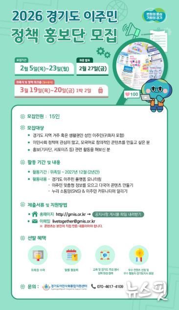 (뉴스핏 = 김수진 기자) 경기도이민사회통합지원센터에서 오는 23일까지 ‘2026 경기도 이주민 정책 홍보단’ 15명을 모집한다.