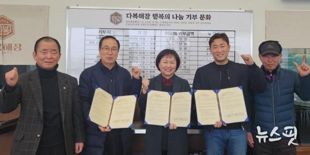 (뉴스핏 = 김호 기자) 파주시 교하동은 지난 4일, 김택철 교하동 지역사회보장협의체 위원장, 이근복 교하동 노인회 분회장, 이만형 문발리 경로당 노인회장이 참석한 가운데 문발동에 위치한 다복해장에서 이웃사랑 실천을 위한 ‘교하사랑나눔가게’협약을 체결했다.