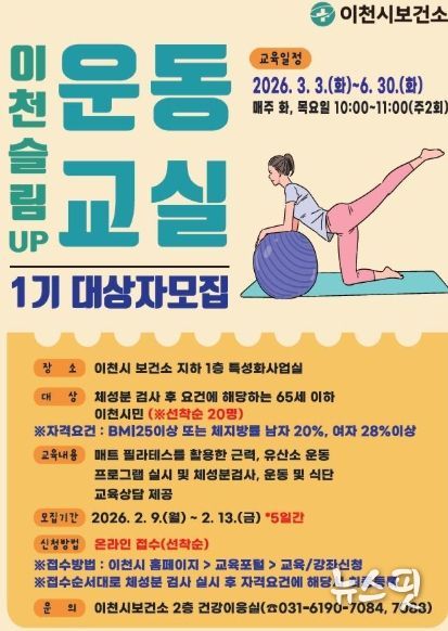 (뉴스핏 = 김수진 기자) 이천시보건소는 시민의 비만 예방과 건강 관리를 돕기 위해 ‘이천 슬림UP! 운동교실’ 참여자를 선착순으로 모집한다고 5일 밝혔다.