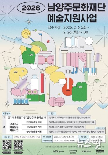 (뉴스핏 = 김수진 기자) 남양주시는 6일 남양주문화재단이 지역 예술인의 안정적인 창작 환경 조성과 시민 문화향유 기회 확대를 위해 ‘2026년 예술활동 지원사업 공모’를 추진하고, 오는 26일까지 접수를 진행한다고 밝혔다.