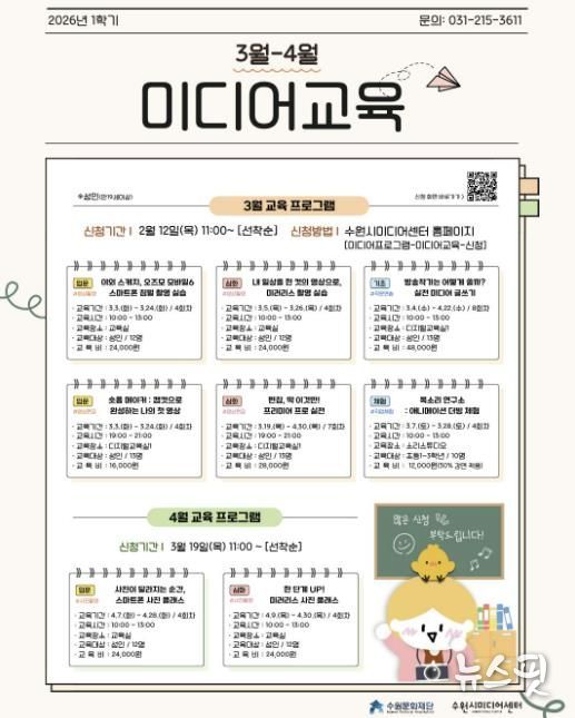 (뉴스핏 = 김호 기자) 수원문화재단 수원시미디어센터는 다가오는 봄, 시민들의 미디어 제작 역량을 깨우기 위한 2026년 3~4월 미디어 교육을 개설하고 수강생 모집에 나선다.